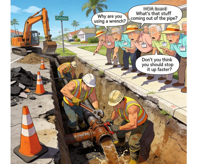Trying to run HHS with MAHA questioning every single decision must feel like a bunch of workmen excavating an old sewer line on a hot, cloudless Florida afternoon, with a group of elderly HOA board members standing nearby demanding answers every two minutes. Why are you using a wrench? What’s that stuff coming out of the pipe? Don’t you think you should stop it up faster?