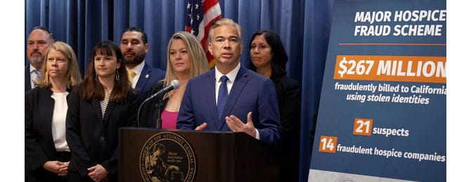 Getting in on the action, State Attorney General Rob Bonta announced the dismantling of an even bigger ring that defrauded California out of $267 million. This group didn’t even go to the market. They went onto the dark web, bought the stolen identities of people who didn’t even live in California, and enrolled them in Medi-Cal. Then, they used “straw owners” to buy 14 different hospice companies and started billing the state for end-of-life care for people who a) weren’t dying, b) didn’t live in California, and c) had no idea they were even in a Los Angeles hospice.