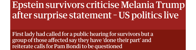 It was exactly what the “survivor groups” have been demanding. Time on the record before Congress. Representative Ayanna Pressley (D-MA) has long demanded Congressional hearings with survivors. She’s been pushing the House Oversight Committee to hold exactly the kind of hearing Melania just called for. But after Melania’s statement, an anonymous group of “survivors” immediately pivoted to saying they don’t want to testify. Yesterday’s Guardian headline:
