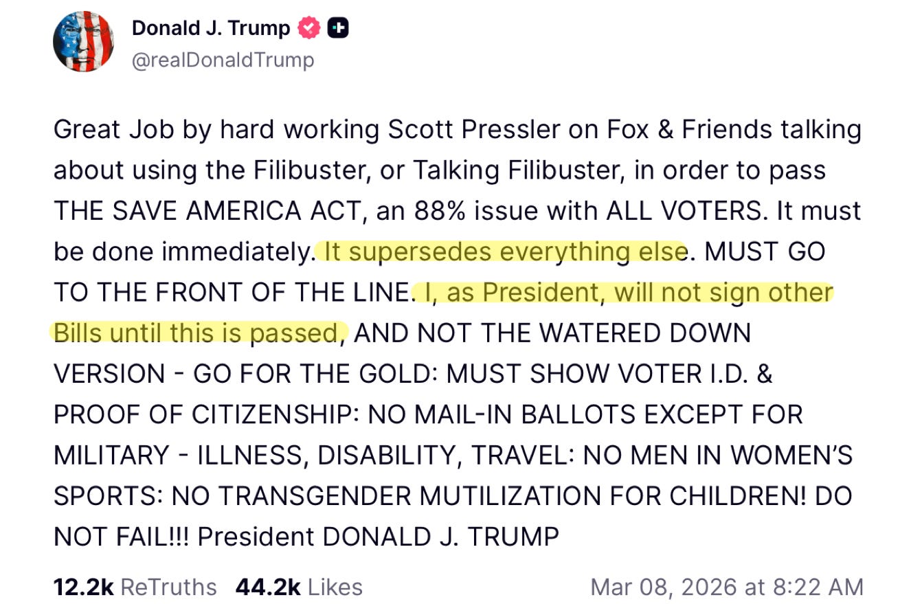 Trump is waging a war in the Middle East, managing a global oil crisis, restructuring NATO, squeezing China’s energy supply, and yet he just told Congress that fixing voting supersedes everything else. “I, as President, will not sign other Bills until this is passed.” For good measure, while they are at it, the President tacked on prohibitions on transgender sports and genital mutilation of children.