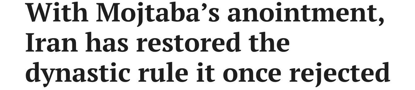 “Iran has named Mojtaba Khamenei, a son of the country’s slain supreme leader, as his father’s successor,” the Times coolly reported, “according to a statement from top clerics published in state media.” The article continued in a similar vein, as though it were the most normal thing in the world, just keeping the country running smoothly. “His ascension, announced early Monday morning, signals the government’s desire for continuity as Iran faces expanding attacks from the United States and Israel nine days into the war.”
