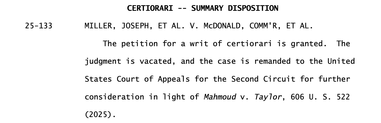 On Monday, the Supreme Court issued a two-sentence order, written by Justice Alito, that vacated the Second Circuit’s decision and sent the case back down to the original district court along with an instruction to re-consider the New York law in light of an earlier decision: a terrific case that issued only a few months ago in June, captioned Mahmoud v. Taylor. Here’s Monday’s entire order: