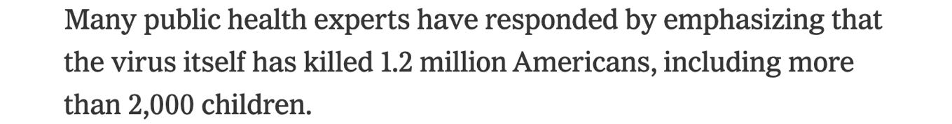 Ha. How many of those killed were “with covid” as opposed to “from covid?” But never mind. We are next racing toward the “net benefit” argument.