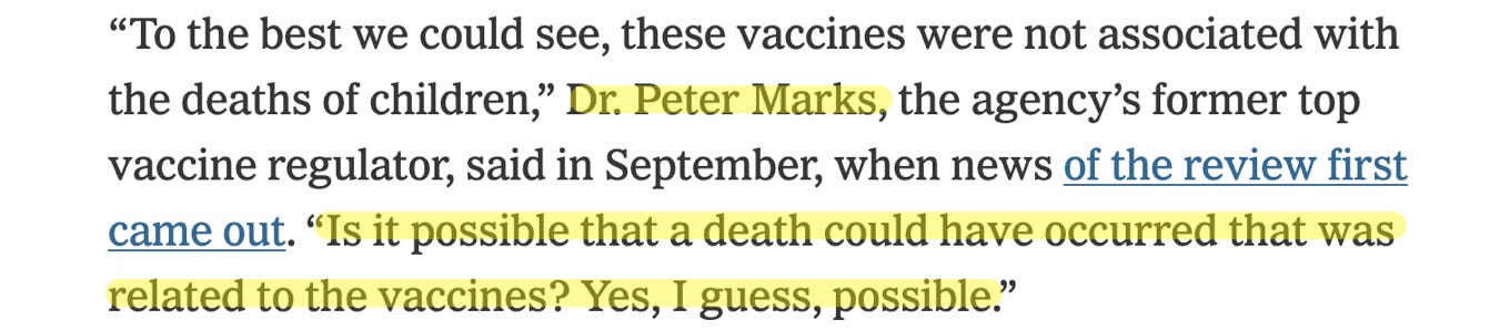 In what is no doubt a type of early CYA, the Grey Lady dragged out this recent quote from Peter Marks, the CBER’s director from 2016-2025, the man who approved every single covid shot and booster before he rage-quit in March (rumors say he was told to resign or be fired). Anyway, Marks said: