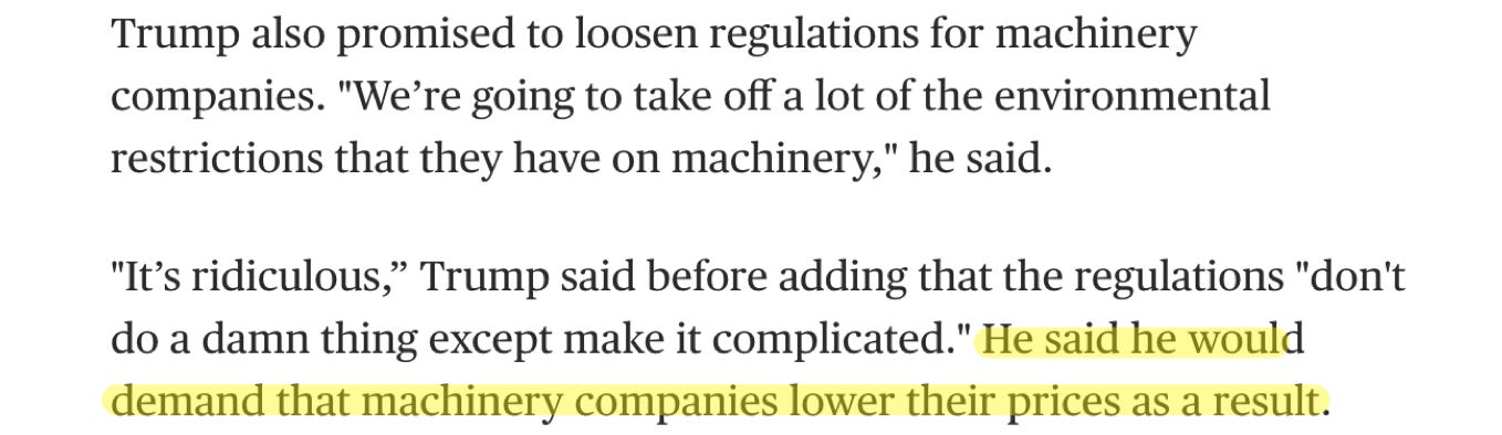🔥 Fortunately, the aid was only part of it. Next, Trump announced a plan to reduce “green” requirements for farming machinery manufacturers, enabling them to produce better, cheaper products for farmers. The last sentence was perhaps the most interesting.