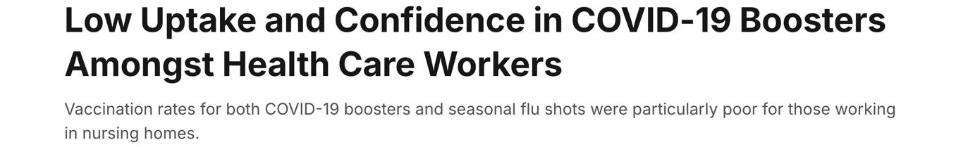 These morons are still acting like it’s 2019. Nobody trusts them anymore. In the CDC’s 2023-24 study of 2,750 healthcare staff, only 15% said they got that year’s annual covid booster shot, with even lower rates for staff in nursing homes. Global Biodefense, November 2024: