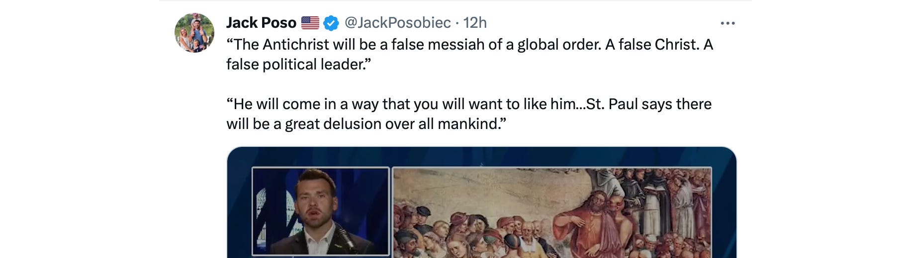 The first example was a tweet from usually-secular Human Events editor Jack Posobeic (2.3 million followers), in a video clip interviewing someone about the Antichrist.