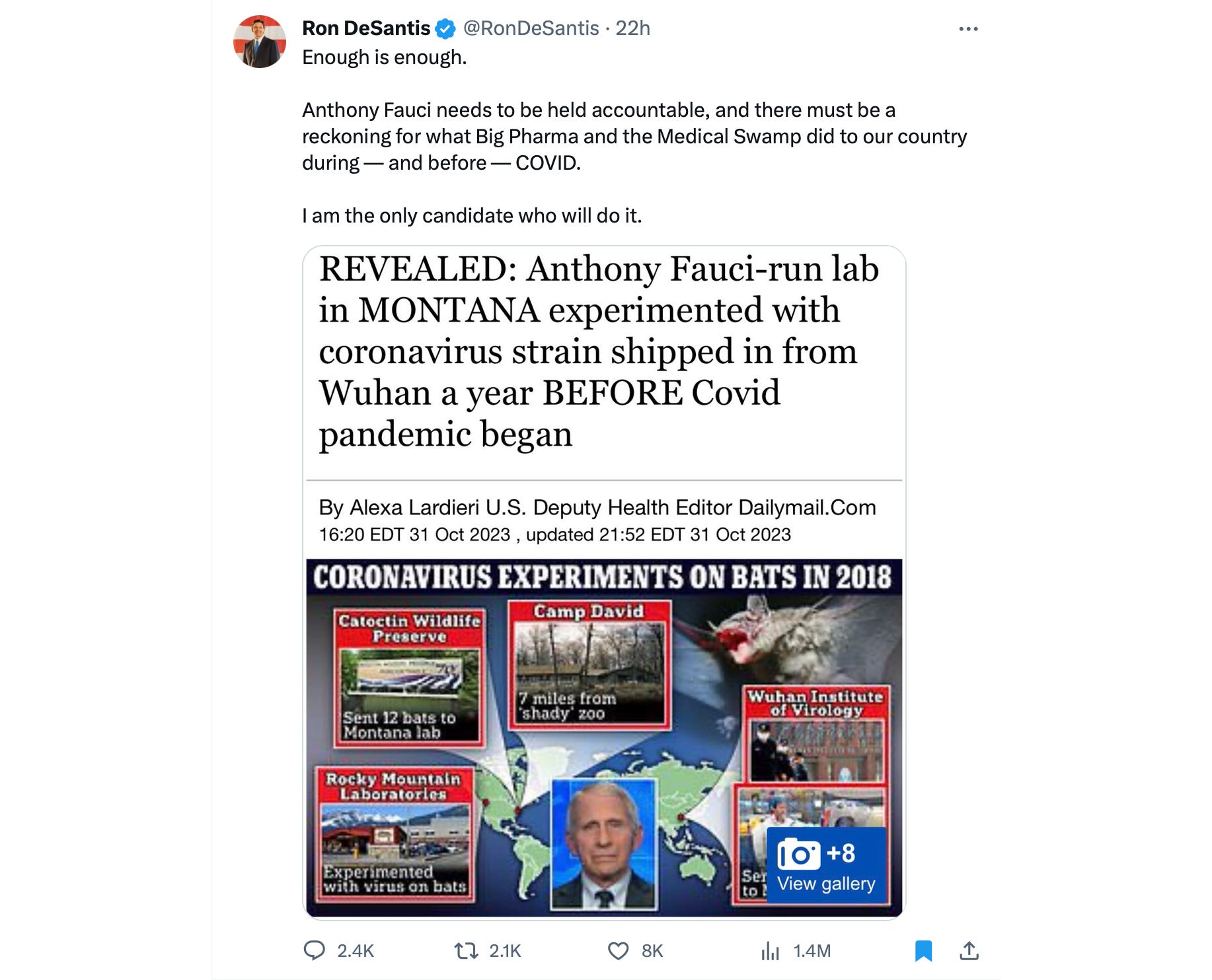 🔥 Yesterday, about two hours after C&C reported on the Wuhan-Montana story, Florida Governor Ron DeSantis posted about the same story: