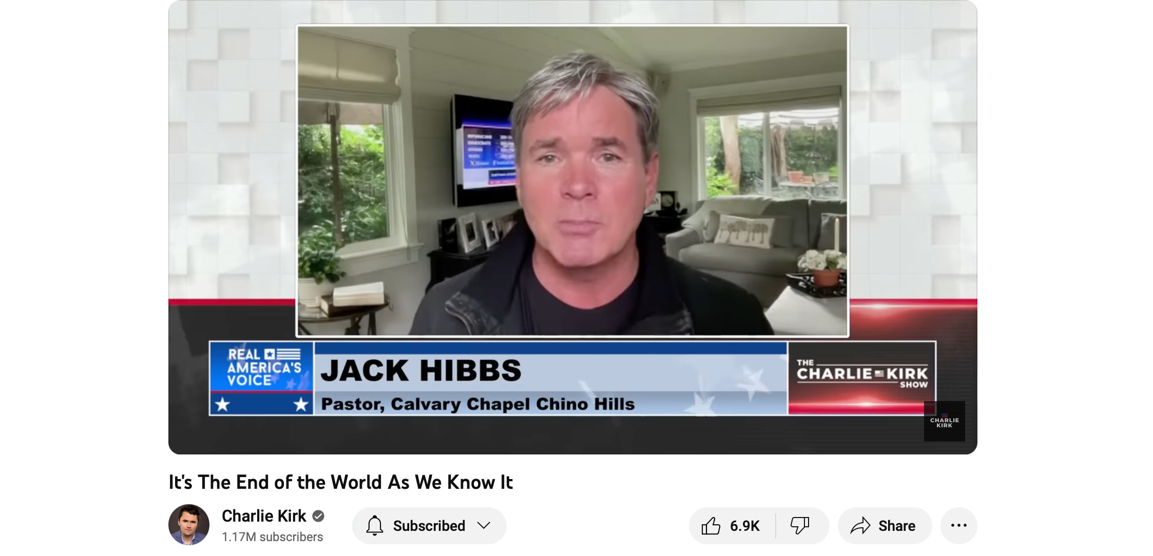 Shortly after spotting that one, I discovered a brand-new video podcast from Turning Point USA’s Charlie Kirk (1.2 million subscribers), interviewing the excellent, pro-America, Calvary Chapel Pastor Jack Hibbs … about how to recognize we’re in the End Times. It’s a good interview, actually. But it is telling about America’s psychology.