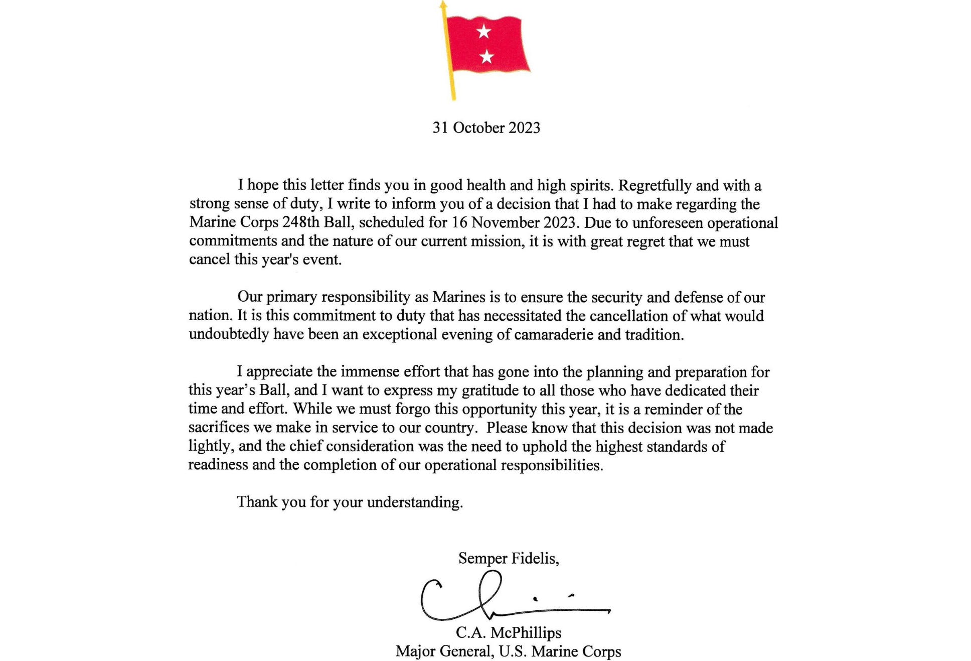 The Military.com article added that Marines spokesman Capt. Joe Wright confirmed that the ball’s cancellation was due to the situation in Israel and the resulting uncertainty in the region, but he stressed there were "no major operational changes or changes in force posture." That seems to conflict with the words of the announcement (‘unforeseen operational commitments’), but okay. Wright also said the move was meant to free up ‘planning staff’ in case the situation in the Middle East changes.