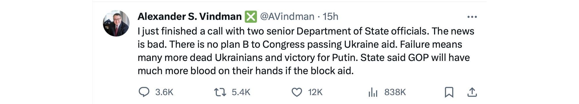 The news IS bad! Our morons in charge have no “plan B.” Their one and only plan is another 100 billion in round dollars — don’t ask how they calculated that — with no actual military battle plan to win the war or whatever the goal is. Vindman’s tweet was a deep-state hostage demand. In other words, cough up the cash, or Ukraine dies.