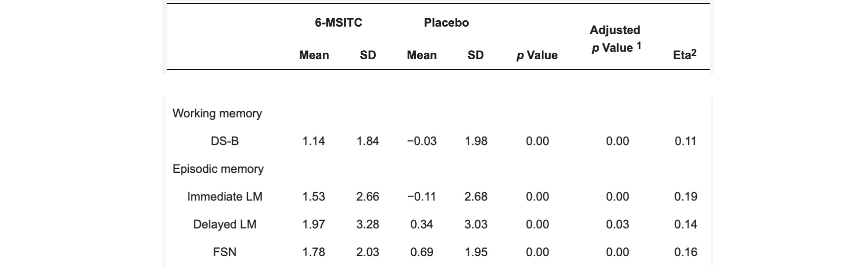 Bottom line: the researchers found that, while it can’t make you any smarter, 6-MSITC significantly improved participants’ memory, both short and long-term, as reflected in the table excerpt, above.