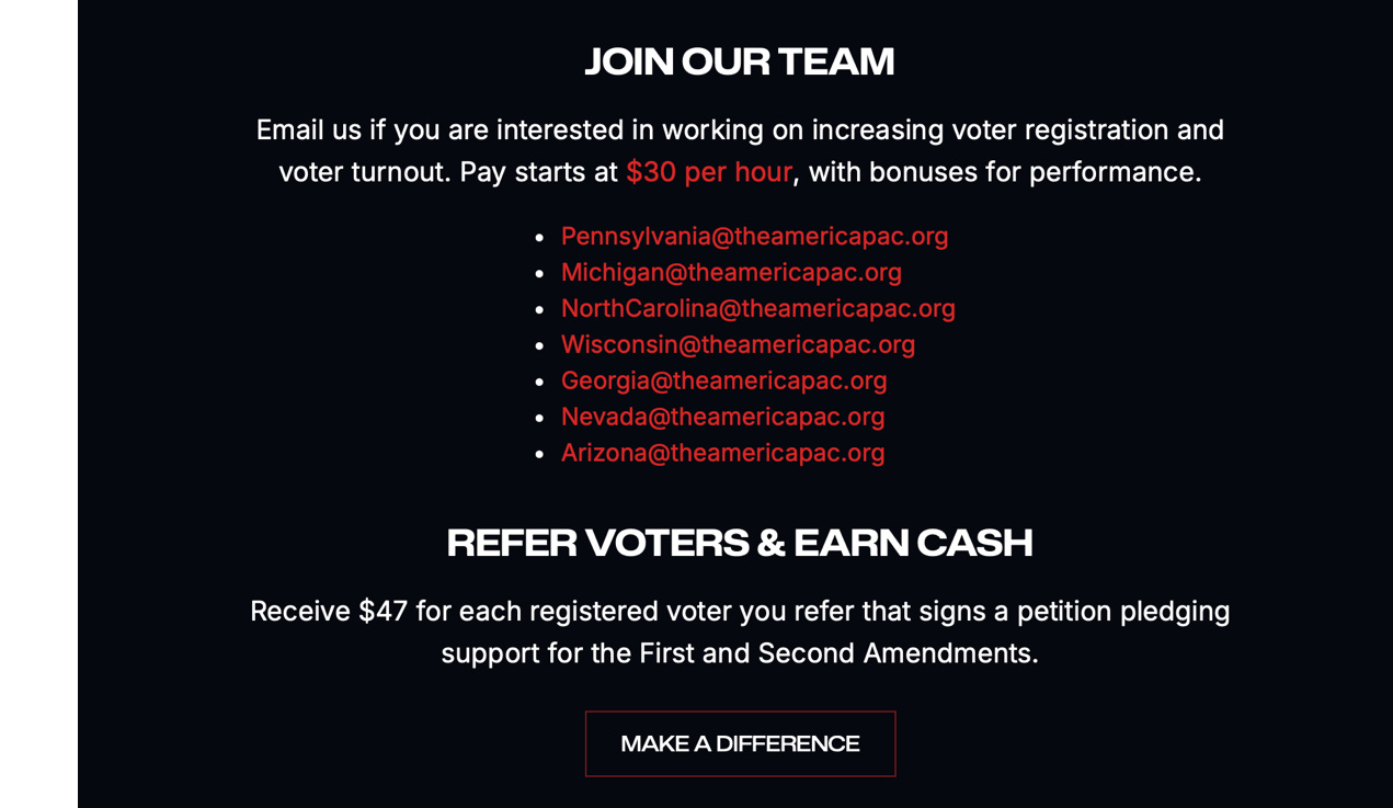 First, the offers. Under “Join Our Team,” America PAC is offering to hire voter registration and turnout workers in the tossup states—including storm-torn North Carolina— at an astonishing $30 an hour plus bonuses.