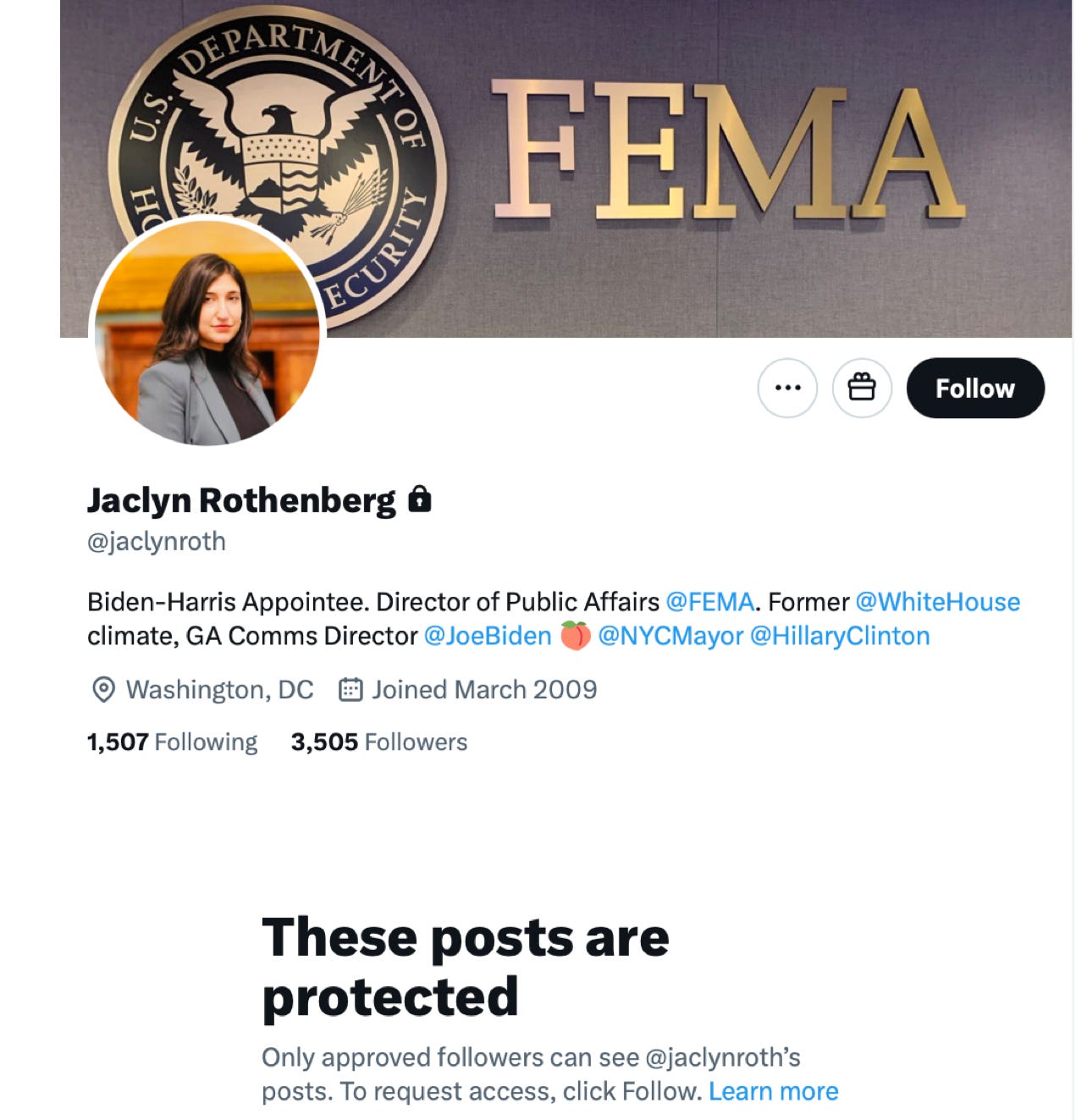 🌪️🌪️ It’s come to this: FEMA’s Director of Public Affairs Jaclyn Rothenberg has locked down her Twitter account. She does not want to hear any more cranky feedback from any more upset citizens.
