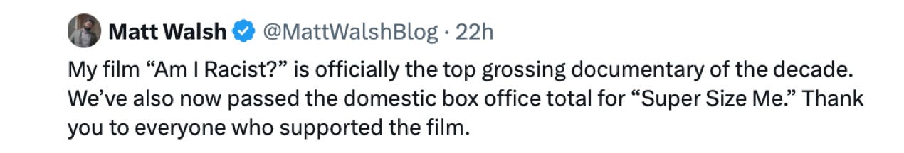 🔥🔥 According to Box Office Mojo, Matt Walsh’s new movie Am I Racist? has now grossed around $12 million on a $3 million budget. making it a breakaway hit. Plus, according to Matt’s tweet yesterday, the internal figures may be even higher, shooting past Super Size Me’s much-discussed $22 million: