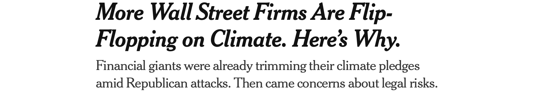 🔥 Suddenly, as the economy’s nose-cone turns back Earthward and heads down, big corporations are ditching — not just ESG — but now their climate pledges too. In bunches. Yesterday’s New York Times carried the story, dramatically headlined: