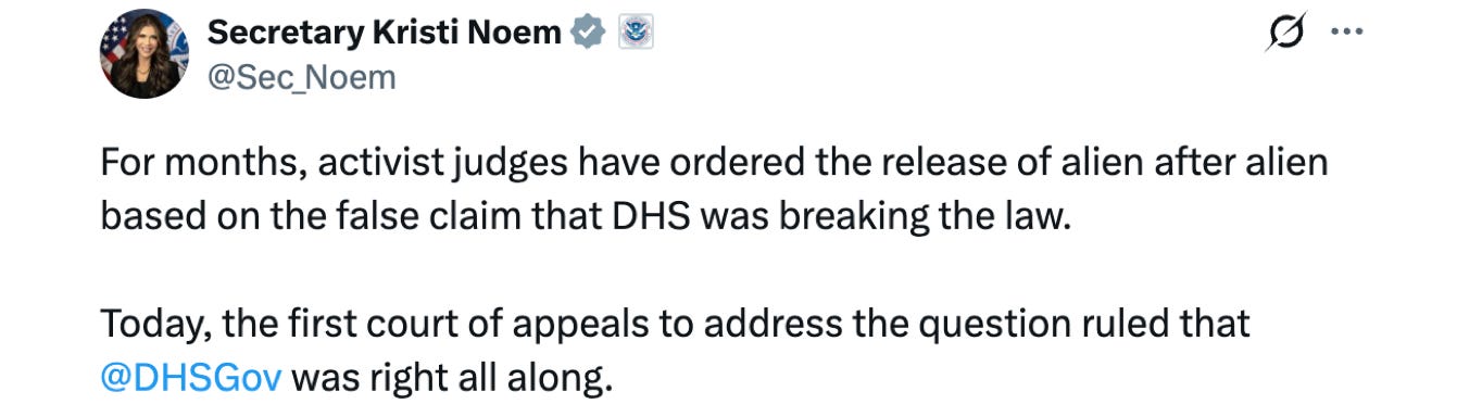 But the Trump Administration took a fresh look at the statute and said, hey, wait a minute, the law says people “seeking admission” to the United States don’t get bond hearings. It just says “shall detain.” Shall. It also says that, if you’re here illegally, you’re still considered to be ‘seeking admission’— you just skipped the line. In other words, a person who never bothered to apply for citizenship doesn’t magically get more rights than someone who at least tried.