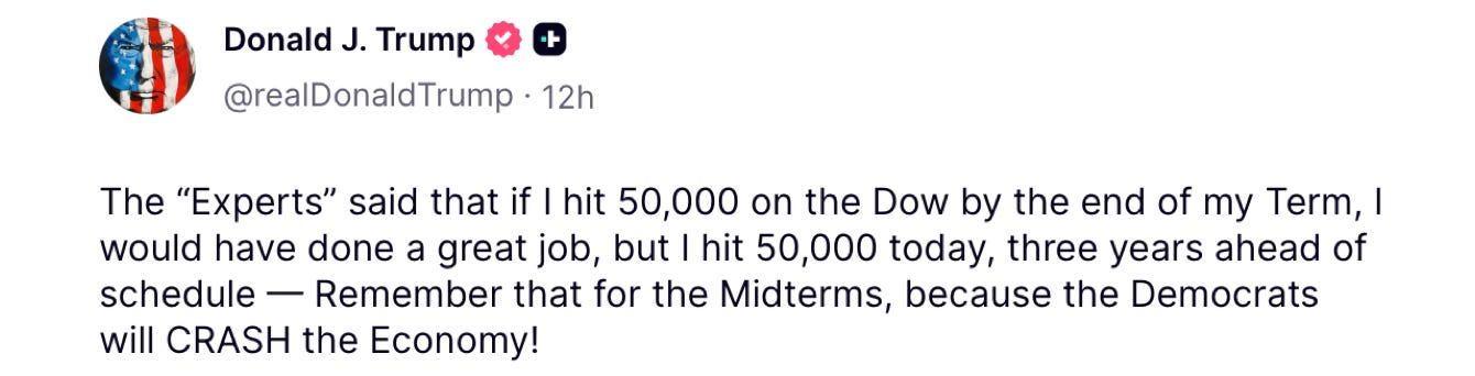 It’s another front-pager the Times chucked in favor of a story about a marine monument to Atlantic fishermen, and the “racist” video the President retweeted. “Stocks hit historic milestone as Dow crosses 50,000 points for first time ever.” They are going to need a bigger book to keep track of all the records President Trump is breaking.
