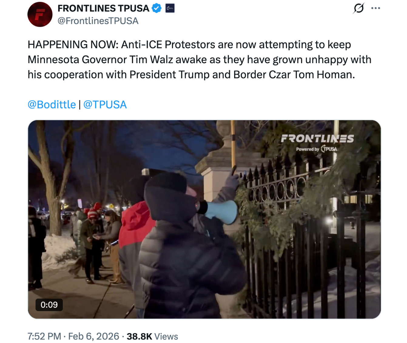 Minnesota Governor Tim Walz didn’t get much sleep last night, since angry, frustrated Anti-ICE protestors screamed maledictions at him and played loud music outside his house all night long. They didn’t like the deal he made with Border Czar Tom Homan to “lower the temperature” after two civilians got themselves shot in Minneapolis.