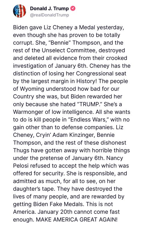Nobody sane, especially President-Elect Trump, was pleased with Biden’s presidential generosity. President Trump blasted away on Truth Social, calling Biden’s medals “fake”: