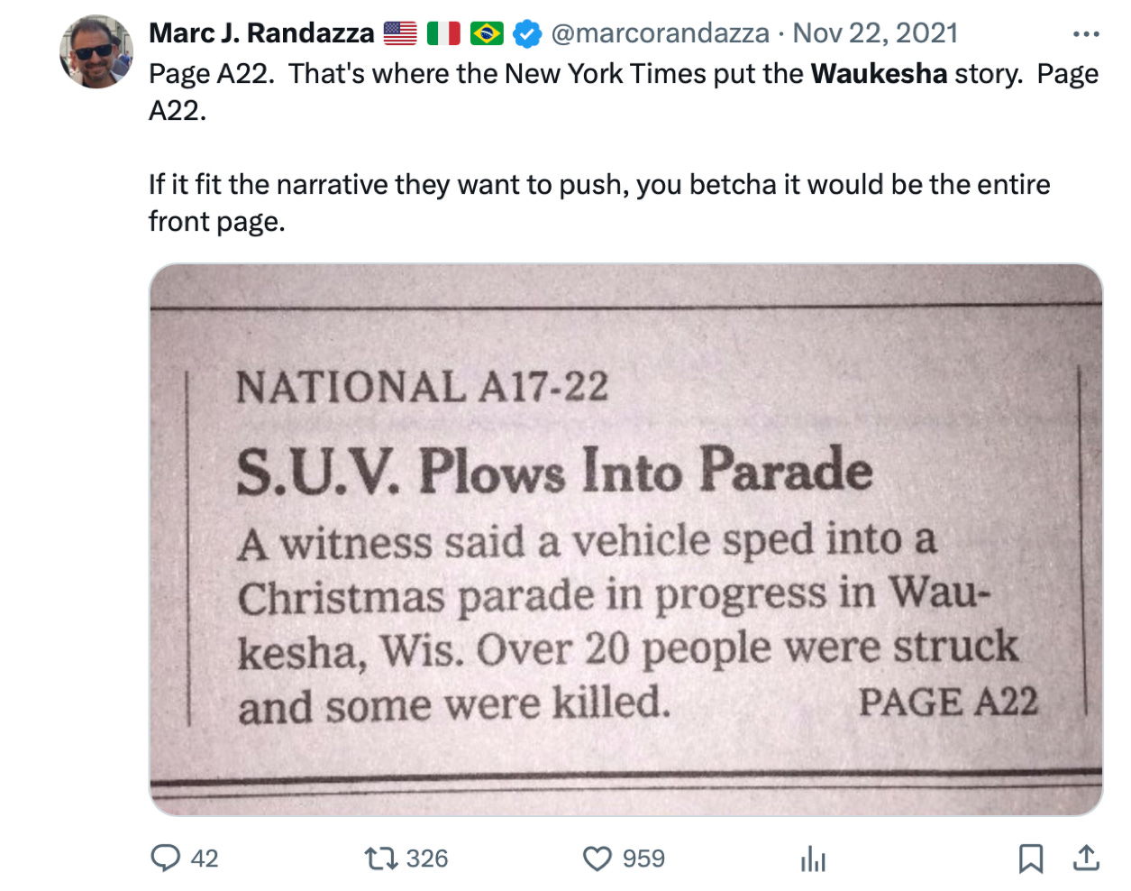The coverage between the two stories could not be more different. On the day after the Waukesha attack, the New York Times ran its story on page A22: