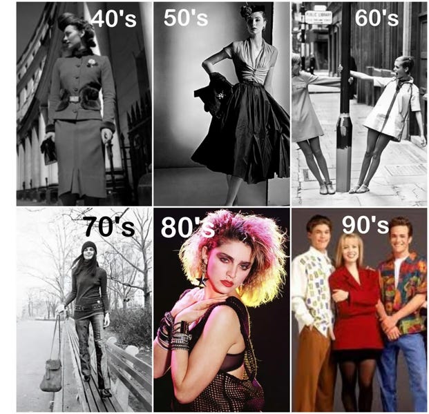 🔥 There are many examples, but perhaps the most obvious symptom of cultural freeze is stalled fashion. The handful of writers calling out stuck culture focus on how distinct was each decade leading up to the Millennium, right before the Patriot Act passed in 2001. Tracing backwards, the cultural evolution trend holds. But from the 90’s forward, zip. Zero. Nada.