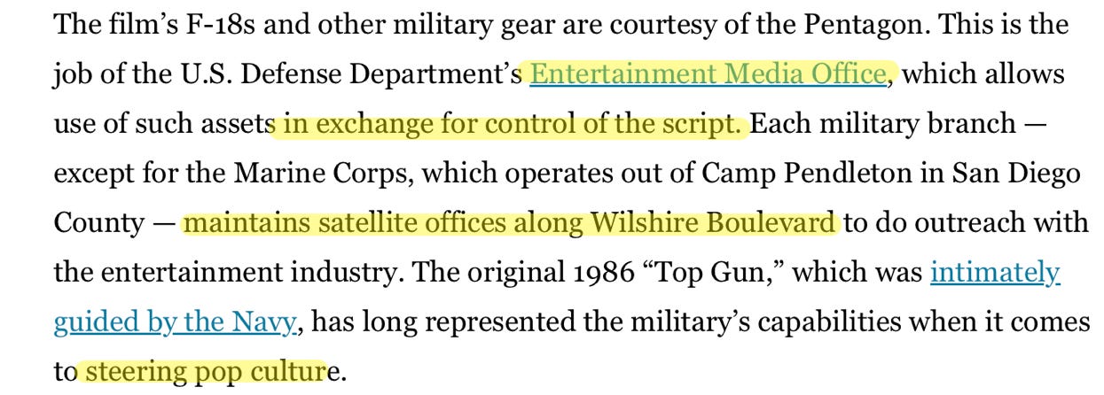 In his 2022 LA Times op-ed, documentarian Roger Stahl explained how the military-intelligence state keeps Hollywood offices and steers pop culture: