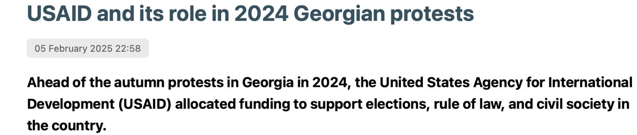 It’s anybody’s guess how they expect anyone to believe that, in the middle of the work week, Americans instantly rallied to support an agency that nobody even heard of a week ago. To understand what you’re seeing, remember that one of USAID’s main dirty tricks is rapidly organizing astroturfed protests. Consider this headline from Caliber magazine, published yesterday, about protest-torn Georgia: