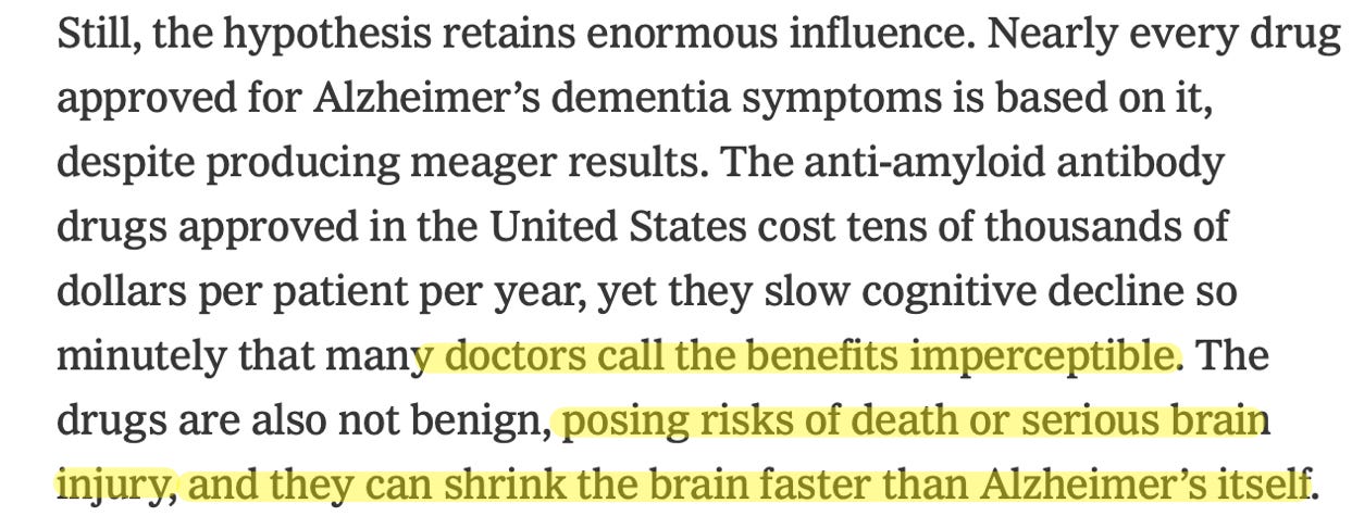 Yes, but why? It will not surprise you that the last 25 years’ worth of NIH-sponsored, FDA-approved Alzheimer’s drugs generously profited big pharma while producing no quantifiable benefits for patients except drastically increasing their risks of death and making their Alzheimer’s worse: