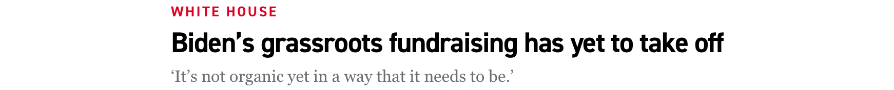 Biden’s fundraising among normal people — voters — is failing. Here’s another highly suggestive headline from Politico, just two weeks ago: