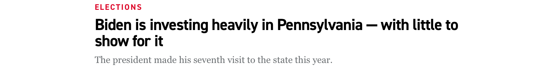 On the other hand, it is painfully difficult to scrape up any positive headlines about Biden polling well, anywhere. Here’s an example from Politico last week: