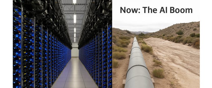 AI doesn’t live in “the cloud.” It lives in a factory— one that eats electricity, water, and land like a steel mill on Adderall. Each chatbot reply to a dumb question and each AI image of a cat on ice skates costs more water than flushing a toilet, and more power than you’d care to know. Multiply that by billions of queries. Now multiply that by every government and corporation on Earth trying to automate everything, all at once.