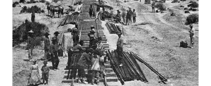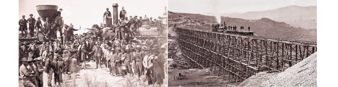 The railroad boom of the 1860s–1890s, with its ruthless land grabs, government subsidies, monopolistic empires, and permanent reshaping of geography.
