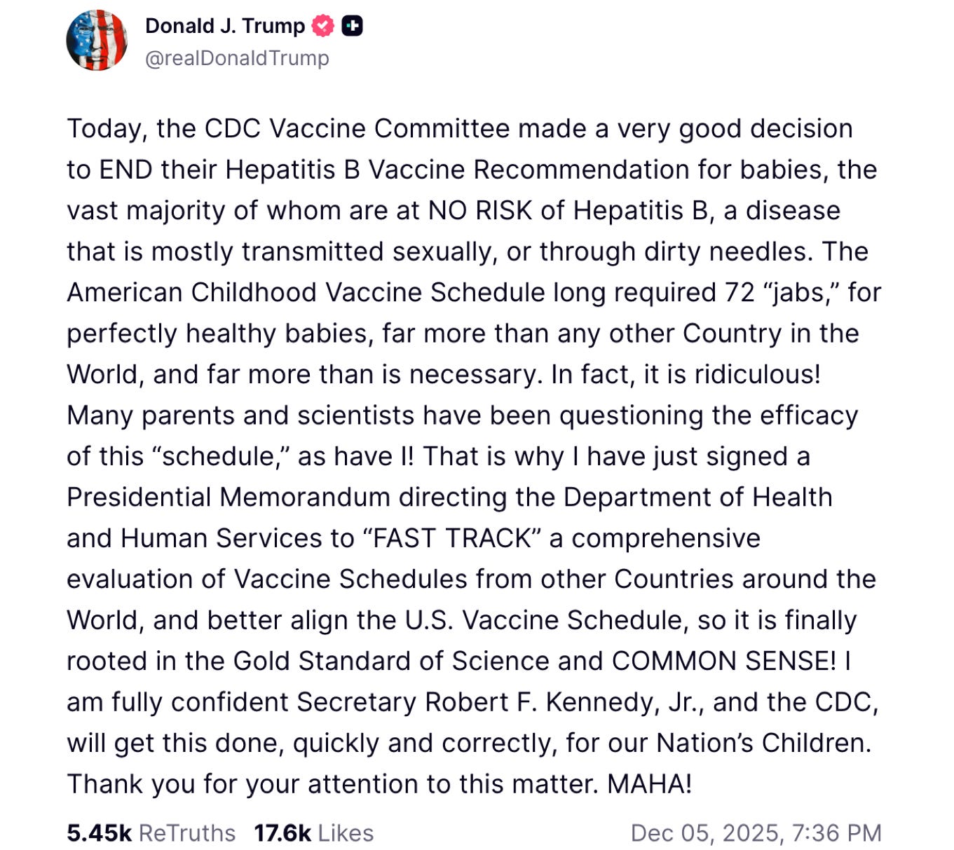 Read the whole thing. It was obviously prepared well before the ACIP’s hearing yesterday. President Trump also posted one of his classic, blistering Truth Social missives, which even used the word, “jabs,” and which called the current Childhood Vaccine Schedule “ridiculous!”