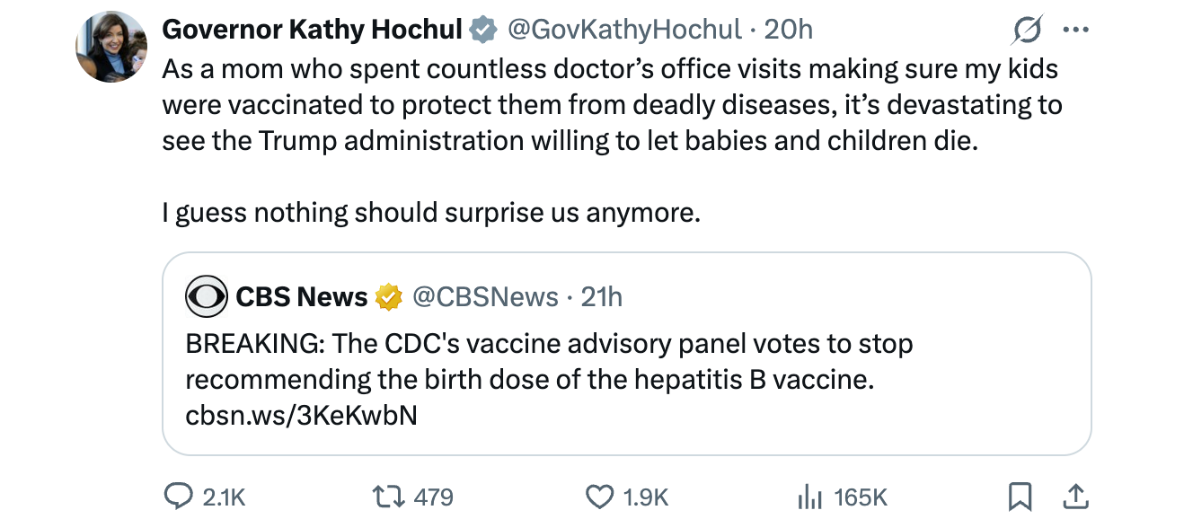 The Times, for one, did not feature the HepB vaccine’s cancellation in any headlines, nor did the ACIP meeting itself even make the NYT’s home page. Although a few months ago this news would have captured multiple news cycles, promoted with the same fire and fury we see from the BlueSky brigades, for some reason, corporate media has relegated it to the back pages.