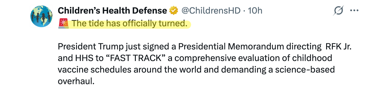 💉 Reactions were unsurprisingly mixed. Long-suffering “antivaxxers” were jubilant, while sold-out pharma shills were preparing for the apocalypse. For instance, Children’s Health Defense, a vaccine-resistance stalwart, which Robert F. Kennedy, Jr., operated before he became HHS Secretary, declared “the tide has officially turned:”