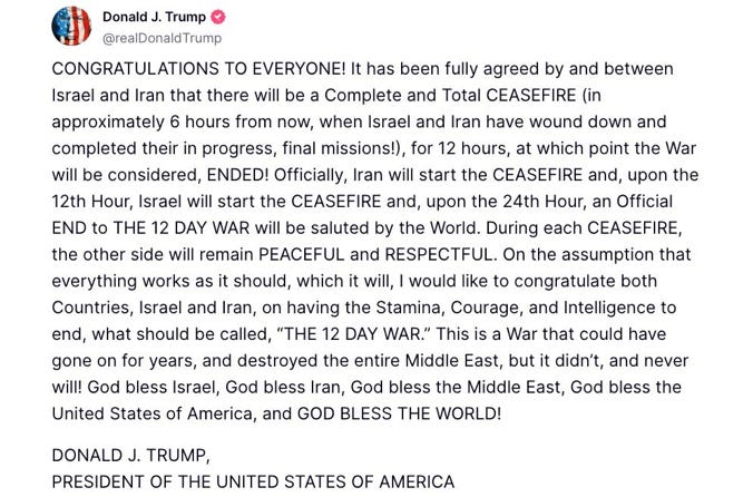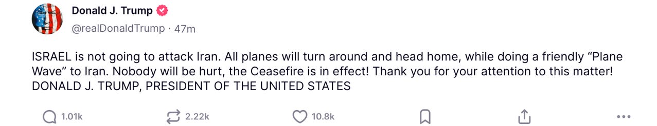 If you only came here to see me take another victory lap for being right again, well, settle in. Yesterday, the New York Times ran a shocked —shocked!— story headlined, “Trump’s Cease-Fire Announcement Catches His Own Top Officials by Surprise.” Somehow it caught everyone else by surprise, too, but somehow we were able to connect the dots. Weird.