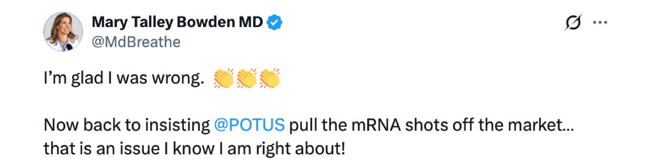 Yesterday’s best conservative reaction, unfortunately rare, was posted by terrific covid doc Mary Talley Bowden, the lanky and graceful Houston Methodist refugee: