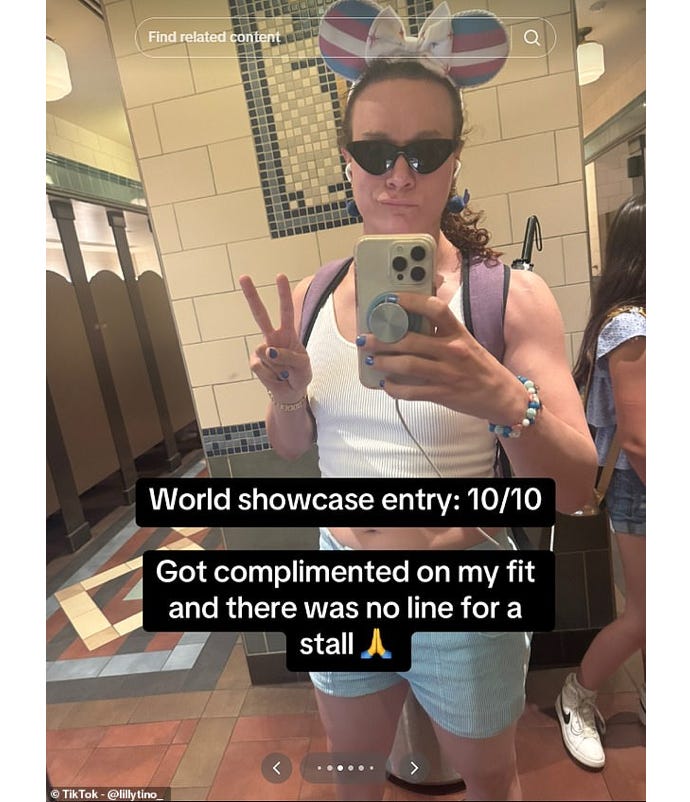 It was also more bad news for the remaining scraps of Disney’s anemic public relations. Regardless of the park’s legal liability, Tino’s TikToks shatter the illusion. Parents expect Disney bathrooms to be safe, private spaces, especially for their children. Seeing an adult biological male snapping selfies in bathrooms near their daughters, bragging about peeing from a standing position, and then posting the film online is a bad look.