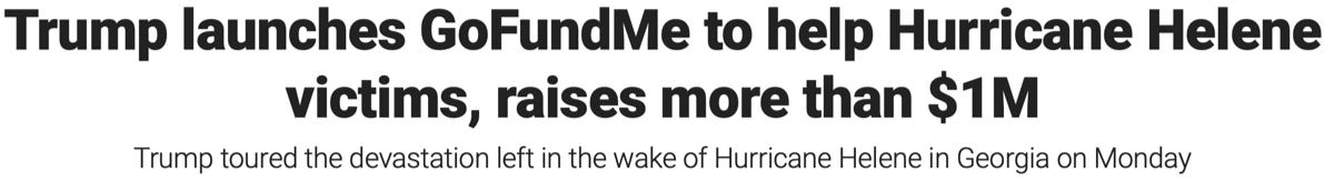 🌪️ As you’re considering that, ask yourself how much taxpayer money should go to Americans devasted by 1,000-year turbo hurricanes? Before you answer, consider these three headlines within the last four days—all since the hurricane hit.