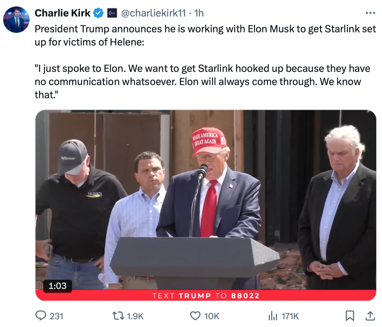 President Trump, on the ground in Georgia, is now working with Elon Musk to coordinate surging StarLink kits to North Carolina as fast as possible.