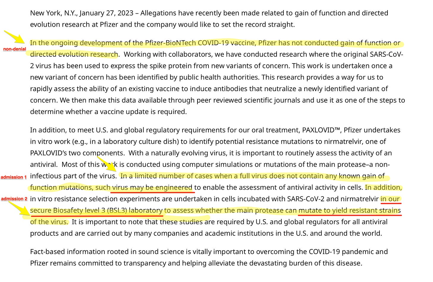 1️⃣ First, note that Pfizer’s key exculpatory sentence sounds like a denial, but it is so narrow that it doesn’t actually deny anything, not really: