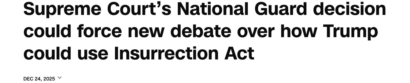 The ruling was issued about three weeks ago and revolved around Trump’s authority under a National Guard-related statute, not under the Insurrection Act. It was also limited to the use of forces to protect federal property and personnel (rather than control riots). But the decision oddly created more questions than it answered. E.g., a CNN headline, Christmas Eve: