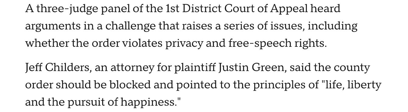 The significance of Tanenbaum’s mask decision, rendered the following June, has never been fully appreciated. This was the very first case (and to this day, I believe, the only mask case) where an appellate court in the United States ruled against one of the central pandemic mitigation policies on constitutional grounds. Even though it wiped out mandatory masking in 33 counties in Florida, and caused the rest of the Sunshine State’s 67 counties to begin quietly retreating from their own mask orders, media stubbornly refused to report on it.