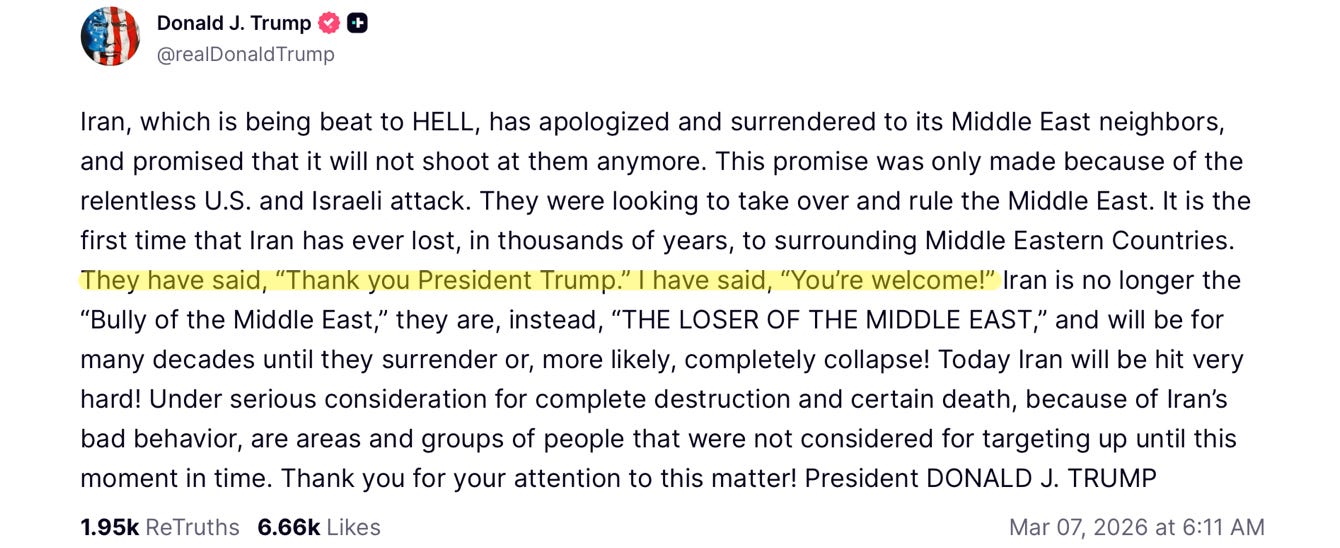 Iran seems not only missile-starved but discombobulated. Yesterday, Iran’s President Pezeshkian —operating under a Temporary Leadership Council, which is what you call the government when you’re not sure who survived the last B-2 run— apologized to neighboring countries and announced that Iran’s armed forces had been ordered to stop striking neighboring countries. A gesture of de-escalation!