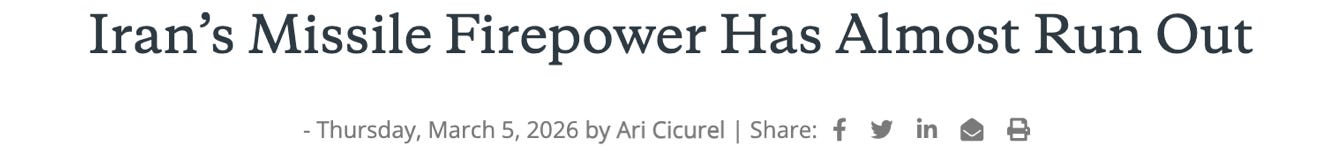 According to D.C.-based Middle East think-tank JINSA, the U.S. and Israel have now destroyed roughly 75% of Iran’s launcher force: