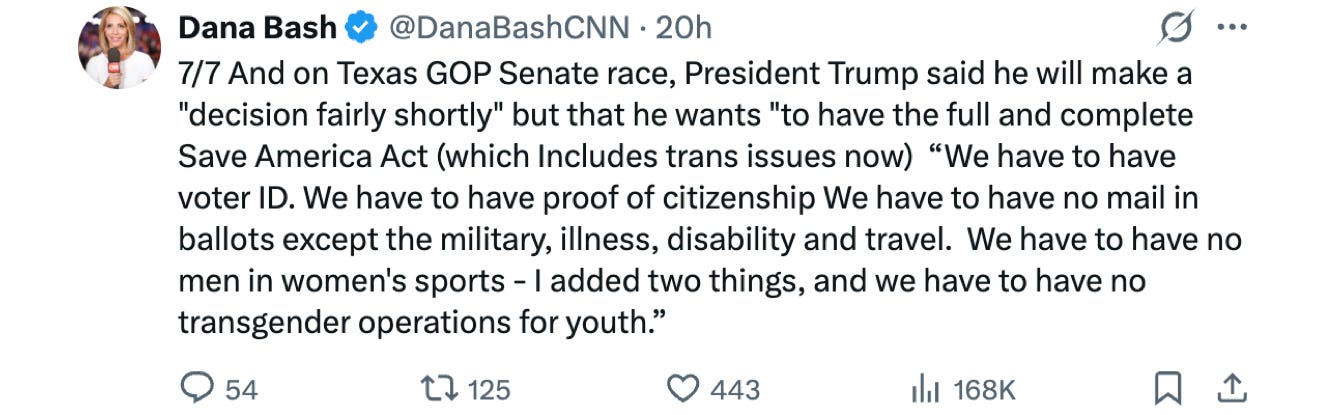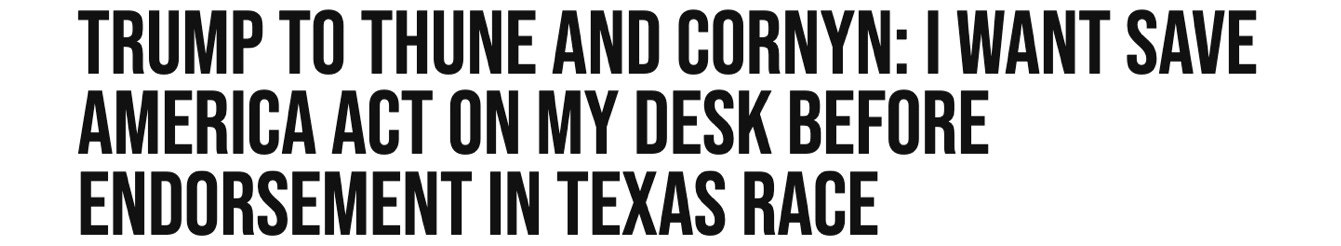 Late this week, several peculiar events occurred in quick succession. First, Trump encouraged the two candidates to “stop” their destructive intra-party fight, said he’d soon endorse one of them, and said he hoped the loser would drop out for the good of the party. Cornyn’s team reportedly prepared a press release announcing Trump’s endorsement. But it immediately became a historical artifact when Paxton responded, saying he’d ‘consider’ voluntarily dropping out if the Senate passes the SAVE Act.