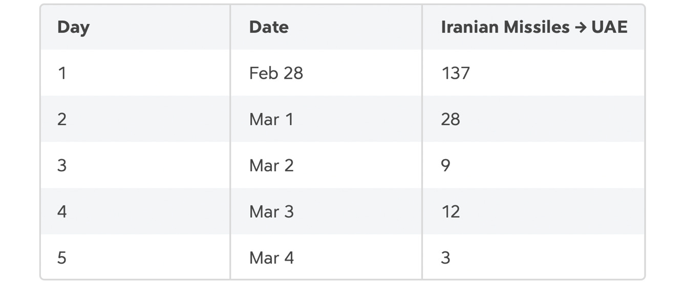 From 137 to three. That’s a 98% drop in the first five days. And it’s not just the UAE. On Wednesday, Joint Chiefs Chairman Dan Caine told reporters that Iranian ballistic missile launches are down 86% overall from Day One. And their one-way drone-launched attacks are down 83%.