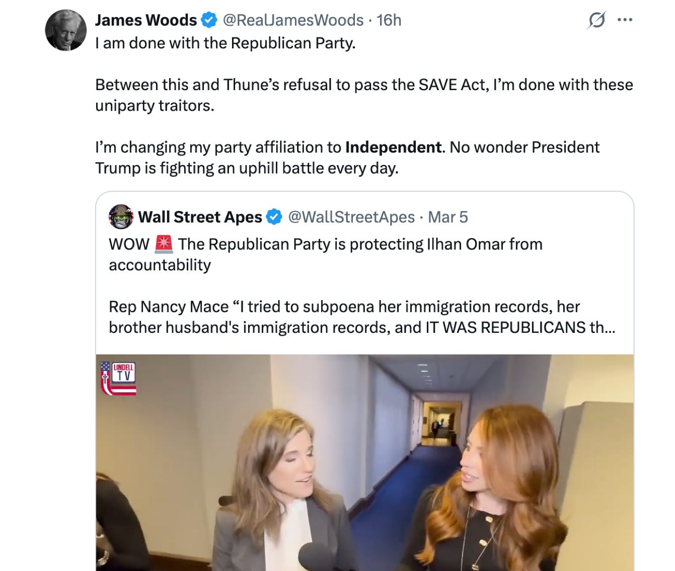 But her post triggered lifelong contrarian James Woods, who had already had it up to here with Senate Republicans for apparently slow-walking the SAVE Act— which, in a minor miracle, was already passed by the House of Representatives.