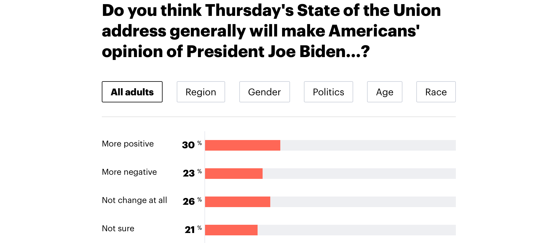 📉 As the fog of hot-takes clears, Americans also seemed uneasy about Biden’s big speech, which according to the surveys looks in hindsight more like a wheel-dropping United flight. YouGov’s post-SOTU poll confirmed our take that Biden might have held ground, but he failed to move the needle: